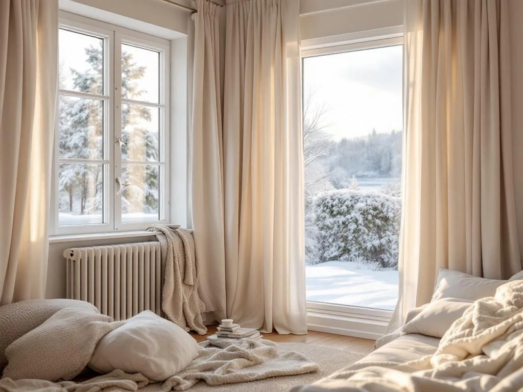 Un simple bas de porte isolant peut empêcher les courants d’air de passer sous la porte. Un rideau thermique épais placé devant l’entrée constitue également une barrière efficace en ralentissant les échanges thermiques. Un tapis épais en fibres naturelles à même le sol contribue à isoler cette zone et à améliorer le confort.
