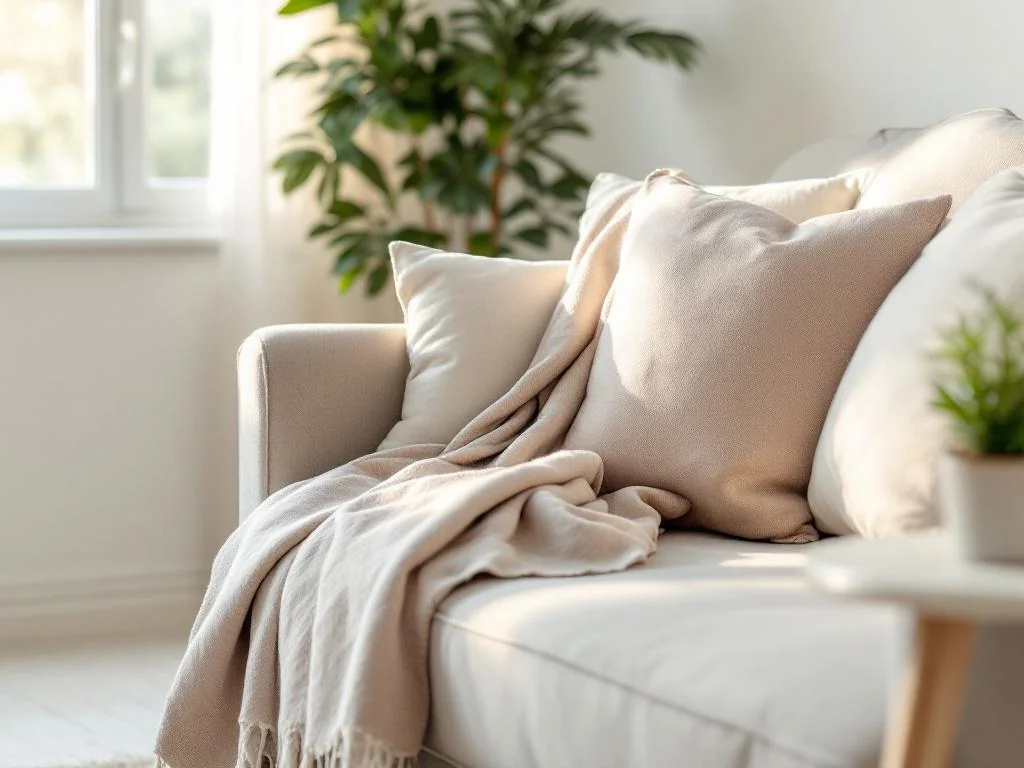 Pour la décoration, remplacer plusieurs coussins par un ou deux traversins en velours peut alléger visuellement le canapé. Cela limite aussi le nombre de housses à laver, ce qui facilite l’entretien.